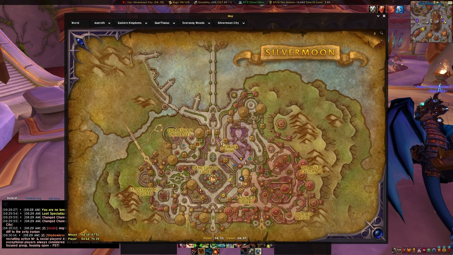 This map shows the view from inside the Wayfarer’s Rest inn. Reaching the location on the map is fairly straightforward – it’s a direct flight to the left. However, there’s a twist: when you reach coordinates 24.69, you’ll discover you need to gain altitude and fly upwards above Silvermoon City, not just across it.