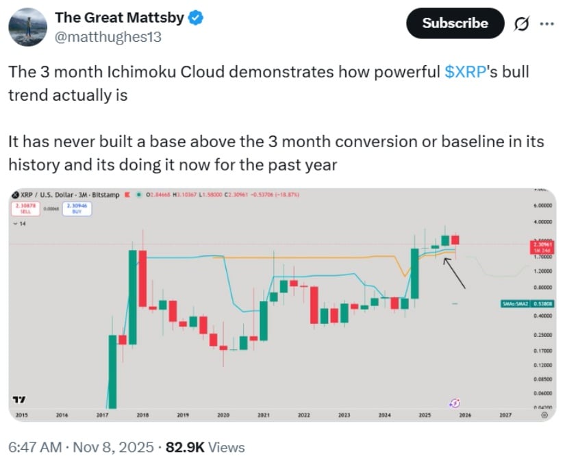 Technical analysts, bless their hearts, are pointing to XRP’s 3-month Ichimoku Cloud chart like it’s the Holy Grail. Matt Hughes, ever the oracle, noted that XRP has traded above the conversion line and baseline for nearly a year-a first in its history. “Real power,” he says. Oh, darling, isn’t it all terribly thrilling? 🌤️