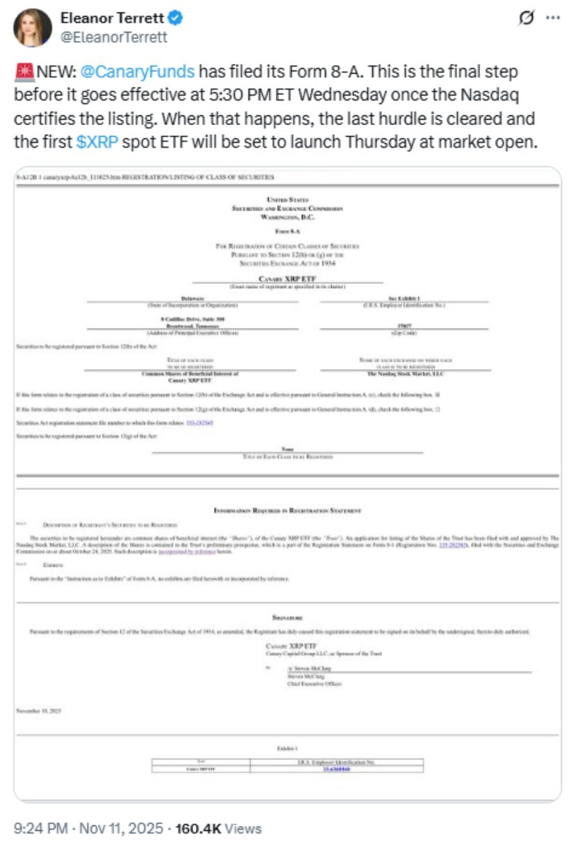 Hold onto your hats, because the Canary XRP ETF (XRPC) is launching on Nasdaq! Eleanor Terrett reported that SEC Form 8-A has been filed, and trading begins Thursday morning. The first U.S. spot XRP ETF, ladies and gentlemen! 🎉