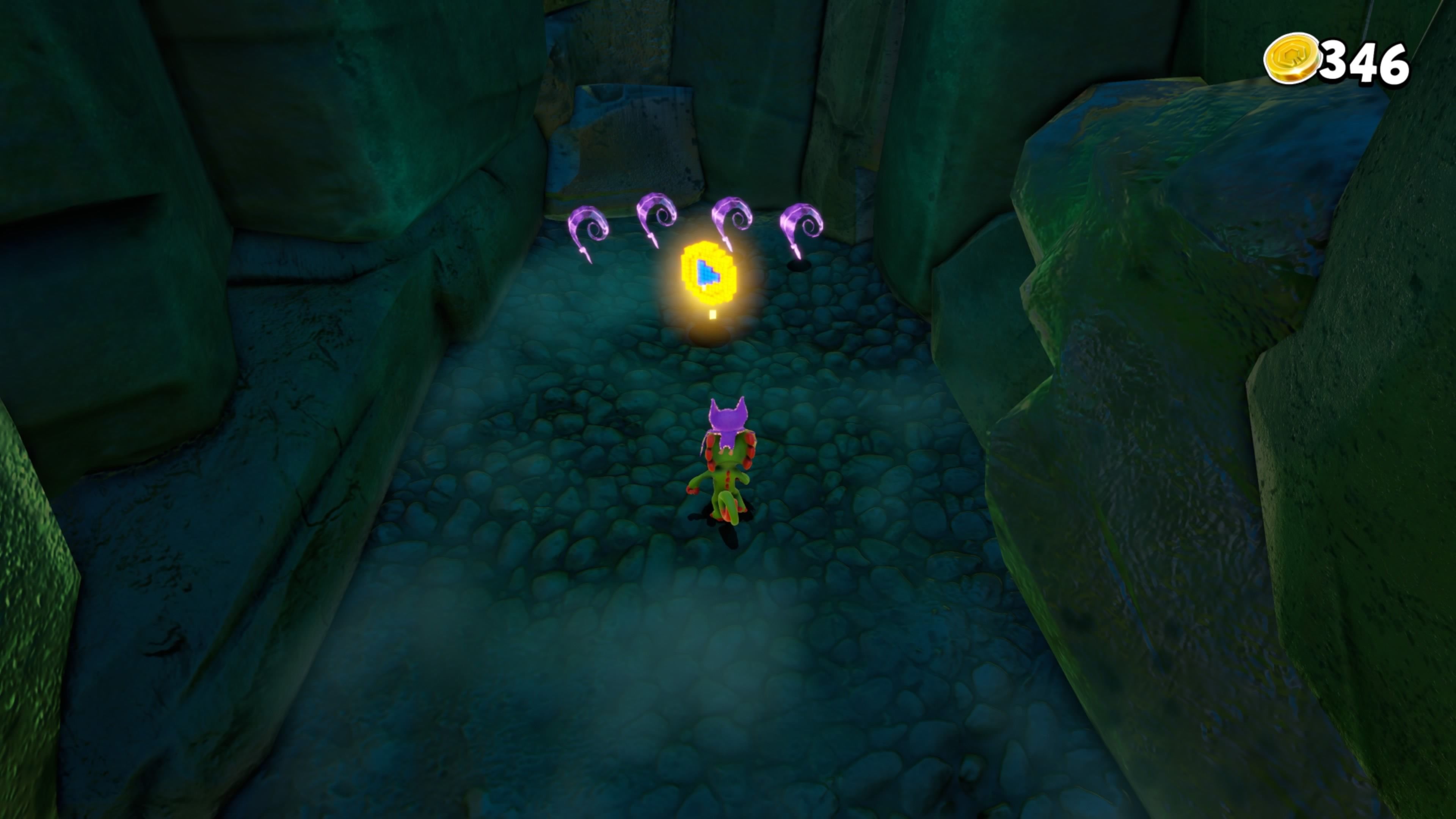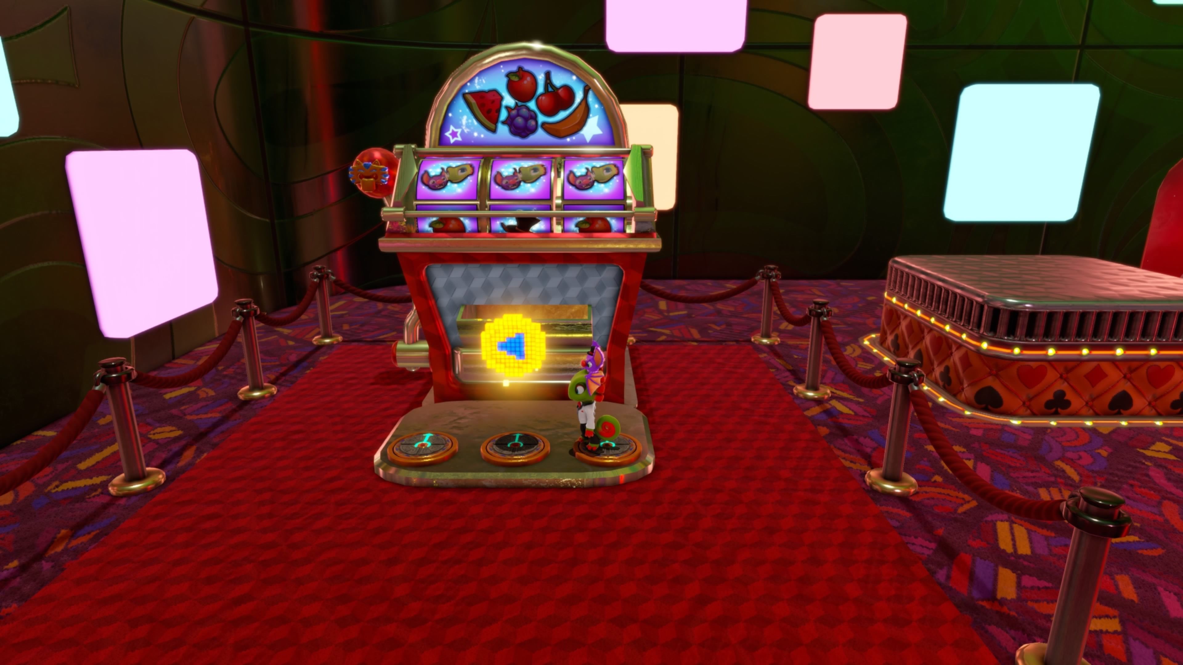 Next to Rextro’s arcade game, there’s a small red slot machine. Use the buttons on the front to play Buddy Slam and try to get three Yooka-Laylee symbols in a row. If you do, a token will come out that you can take.