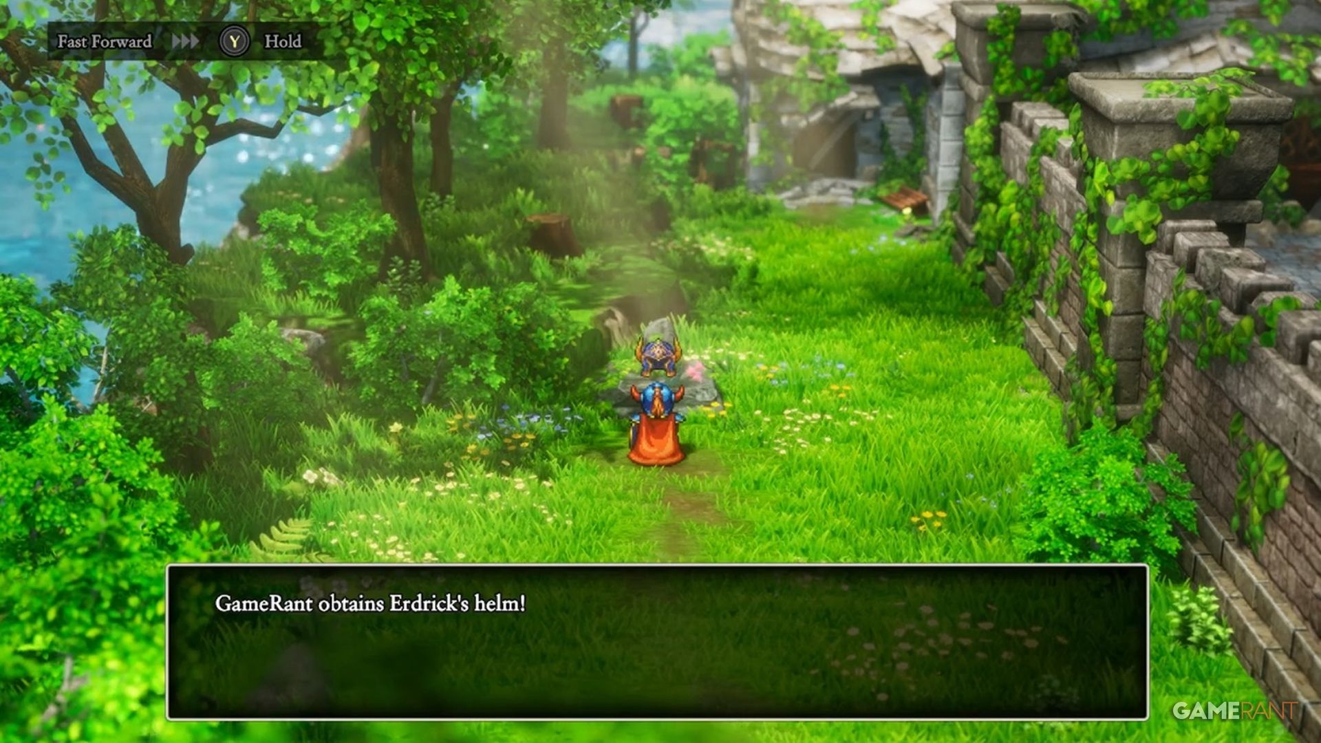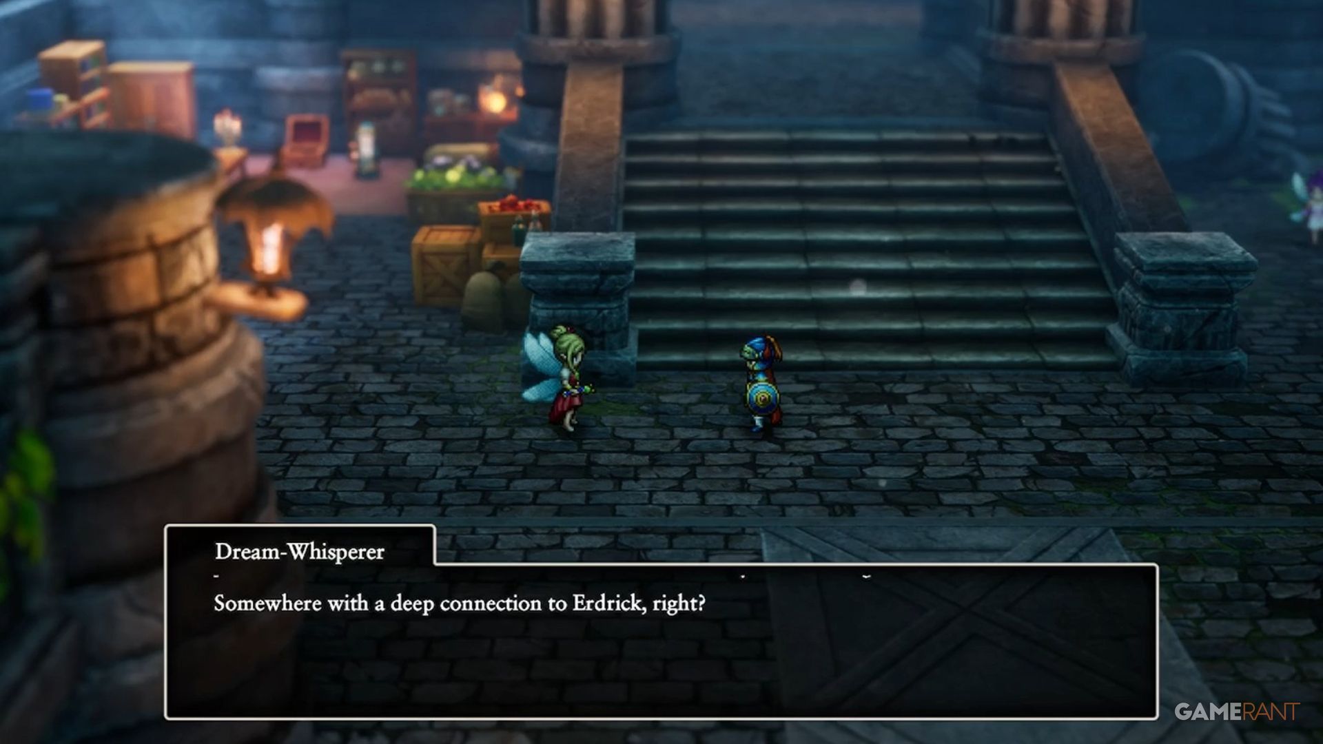 Head to the left side of the area and check the grave โ you’ll find Erdrick’s Helm there. Once you have it, talk to the Dream Whisperer to continue.